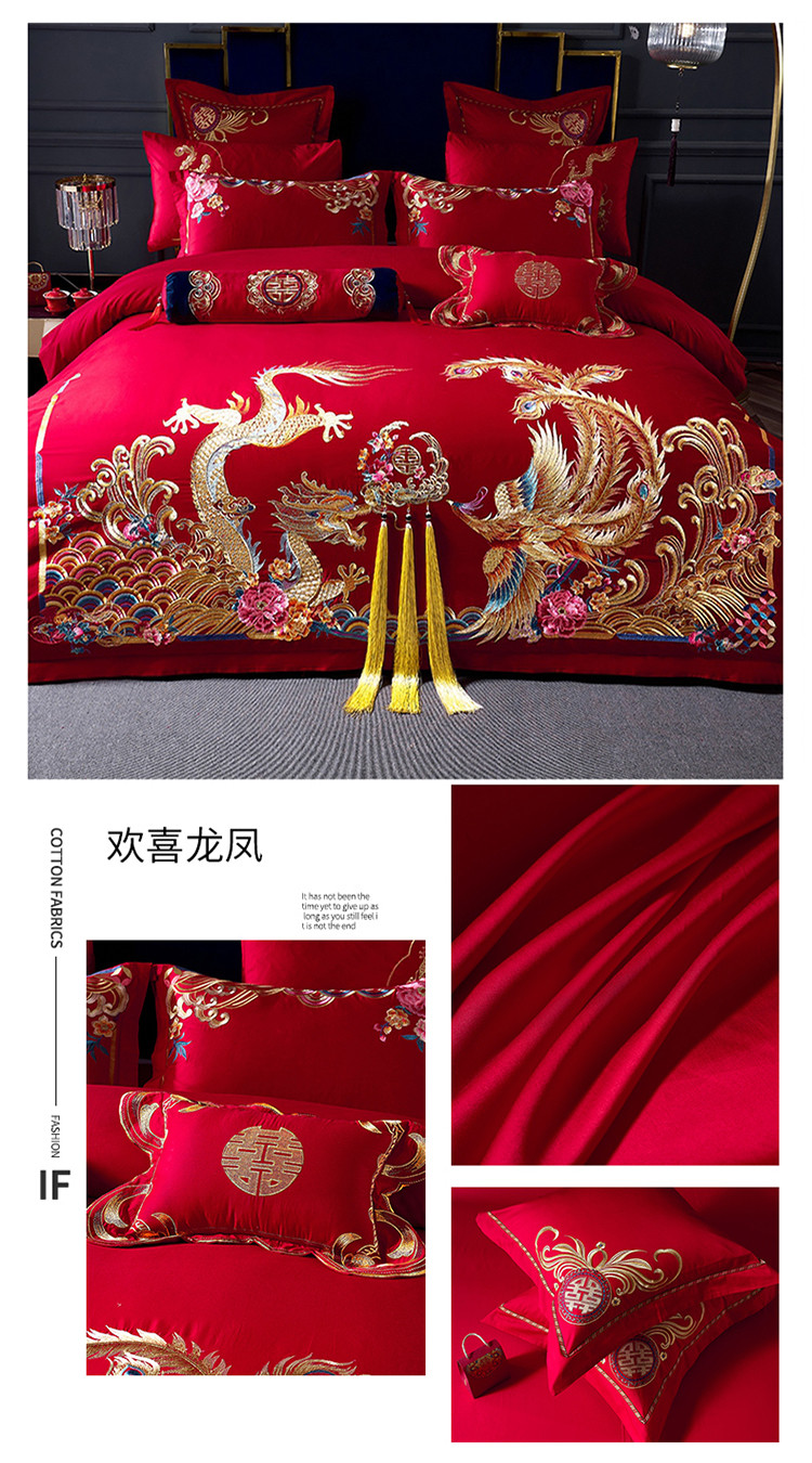 Wedding Four-Piece Set, Embroidered Pure Cotton, New Wedding Satin, Bright Red Dragon and Phoenix, Wedding Quilt, Long-Staple Cotton Bedding