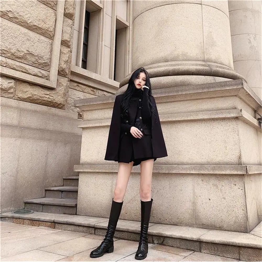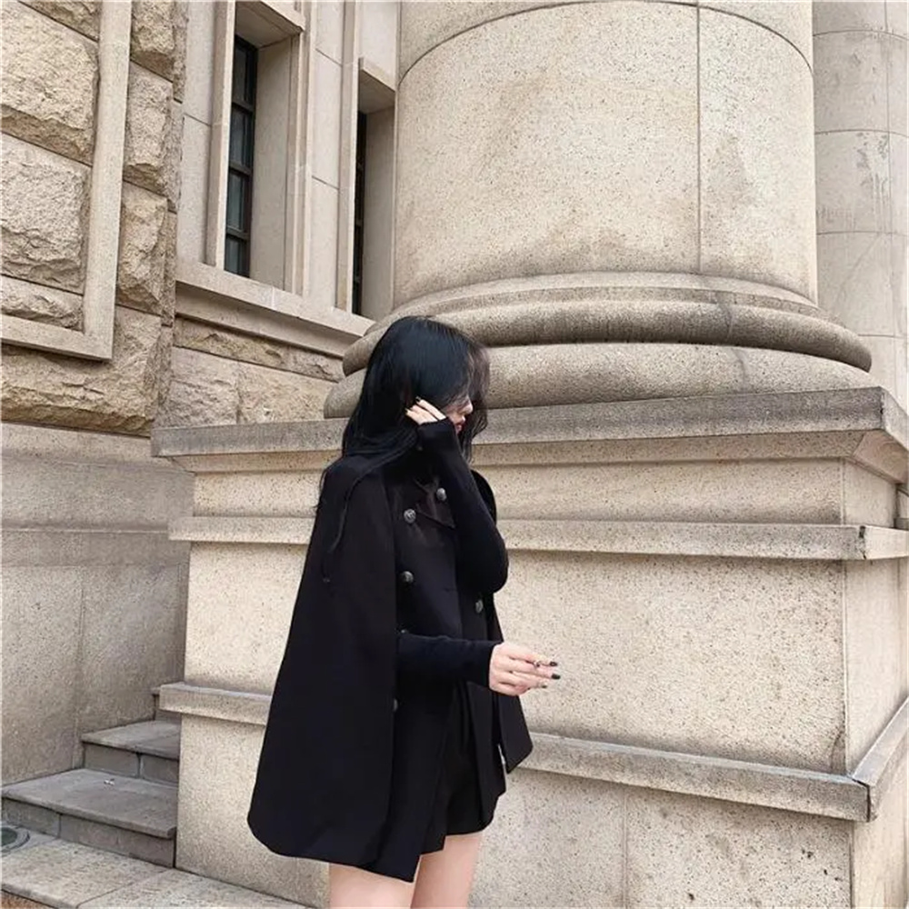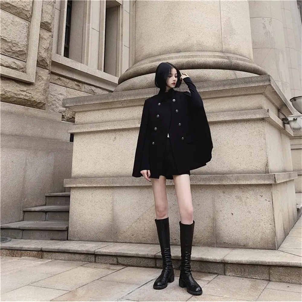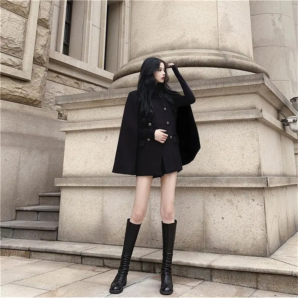 Korean Style Internet Celebrity Black Cape Coat for Women, Autumn 2025 New Versatile Loose Stand-Up Collar Woolen Coat, Mid-Length