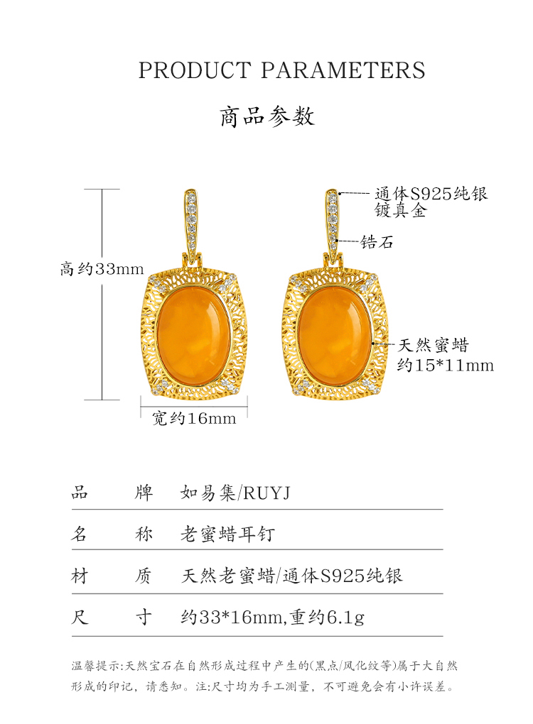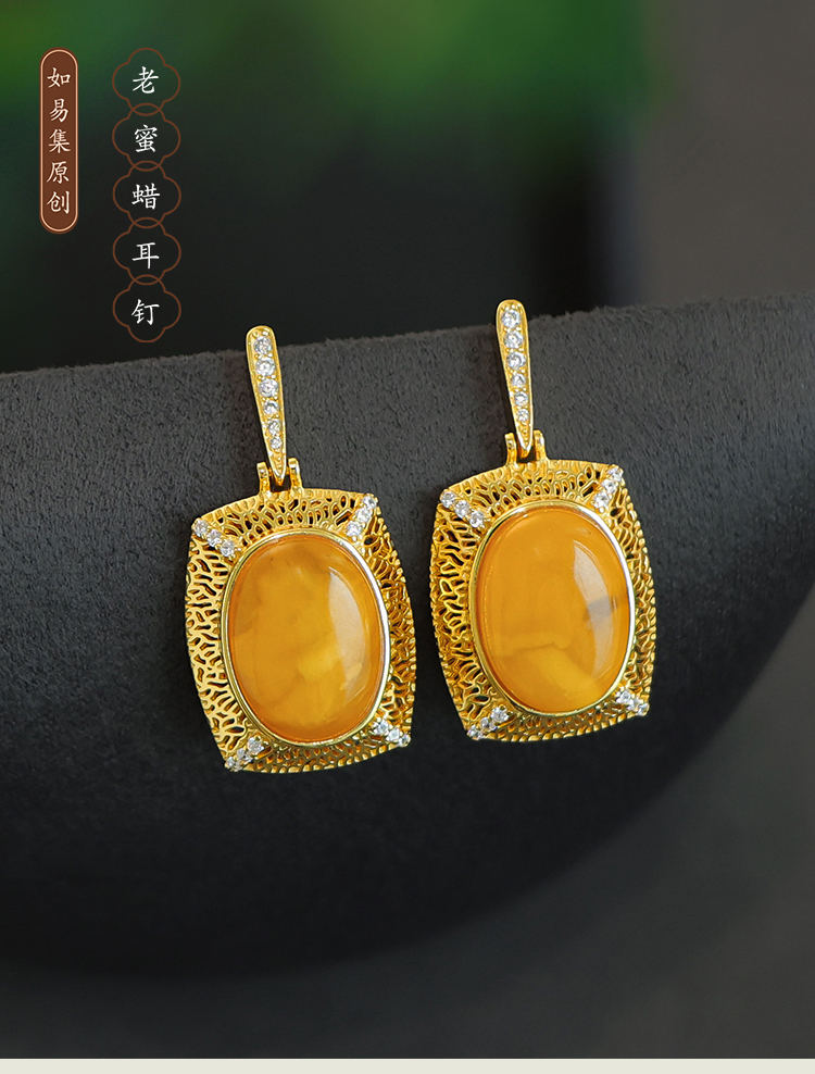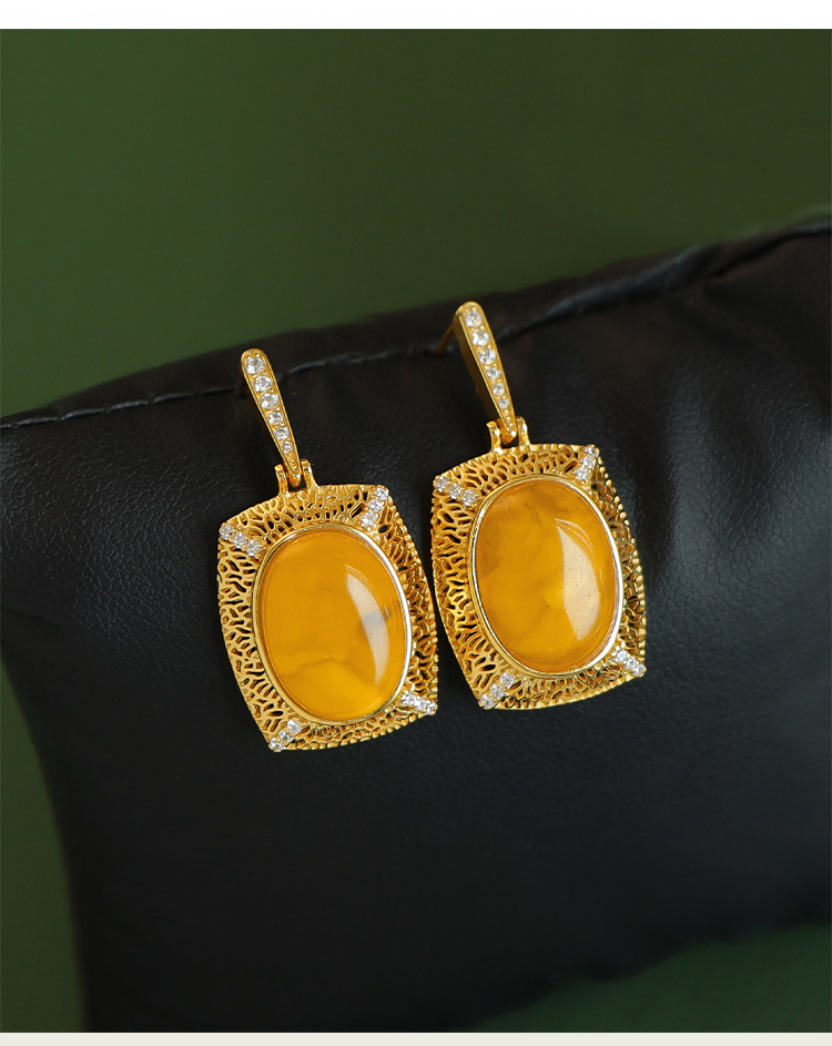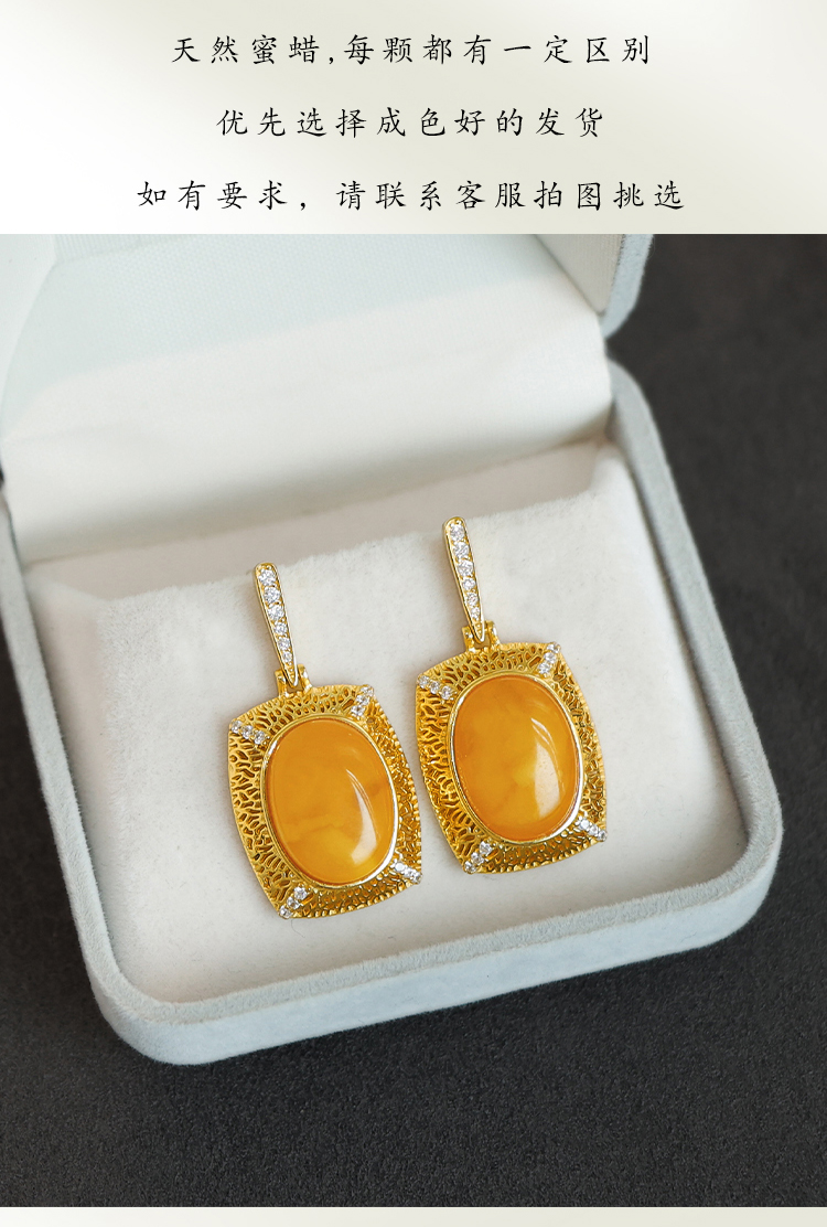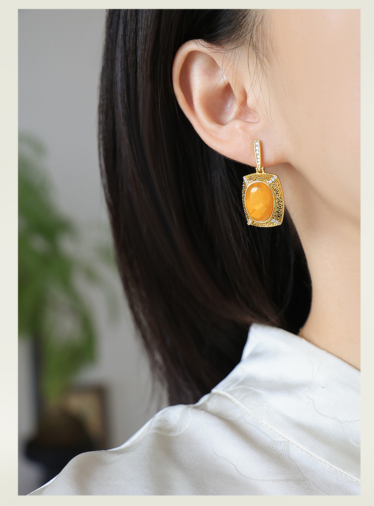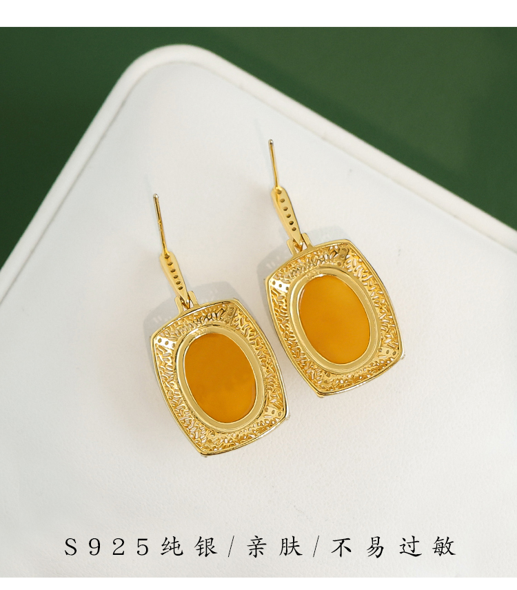 Beeswax Earrings, Natural Chicken Oil Yellow Amber Earrings, Luxurious Palace Style Yellow Earrings, High-End Sterling Silver Earrings