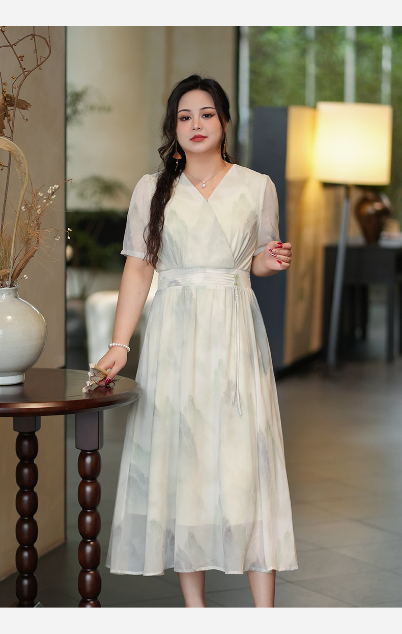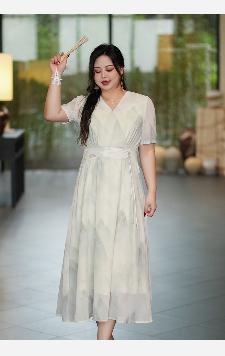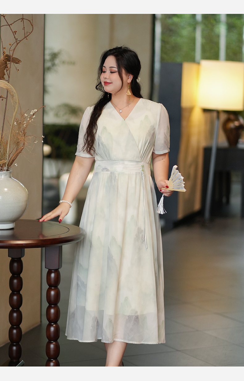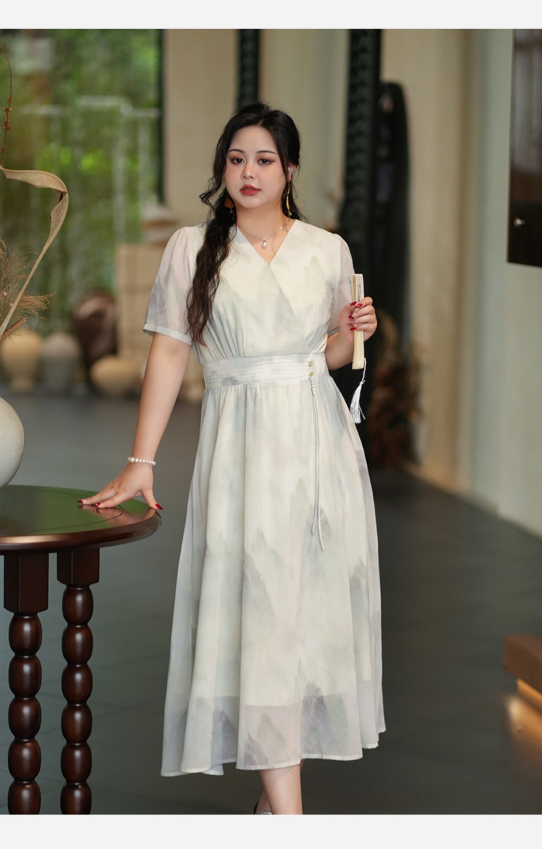 Mrs. Dave's Plus-Size Women's Clothing, New Chinese-Style Dress for Summer 2025, New Model for Chubby Women, Tummy-Covering, Chinese-Style Ink Painting Dress