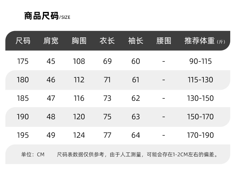 Size175/L.,180/XL.,185/2XL,190/3XL,195/4XL