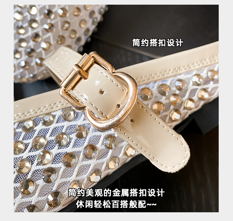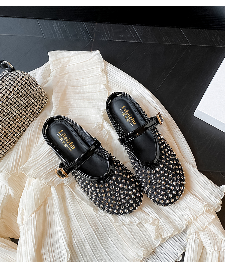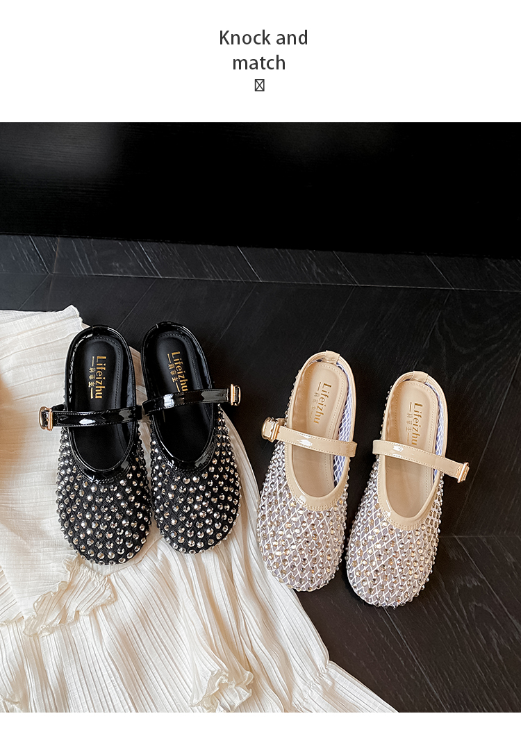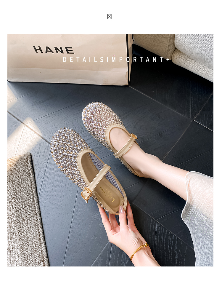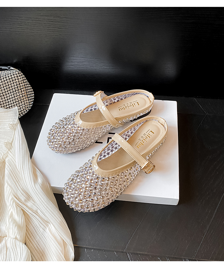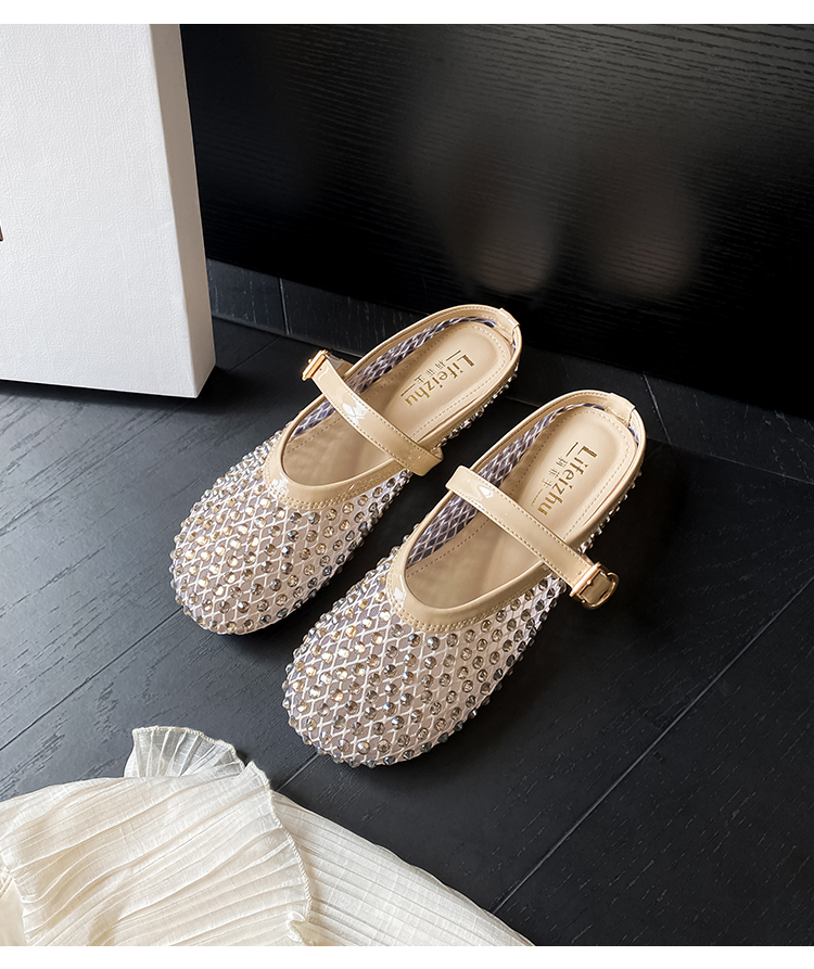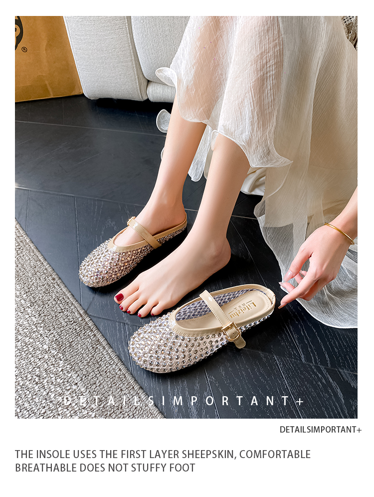 Open-Toe Slippers with Buckle and Rhinestones, Niche Half-Slippers for Women, Summer 2025 New Style, Mesh Breathable Fairy Slippers