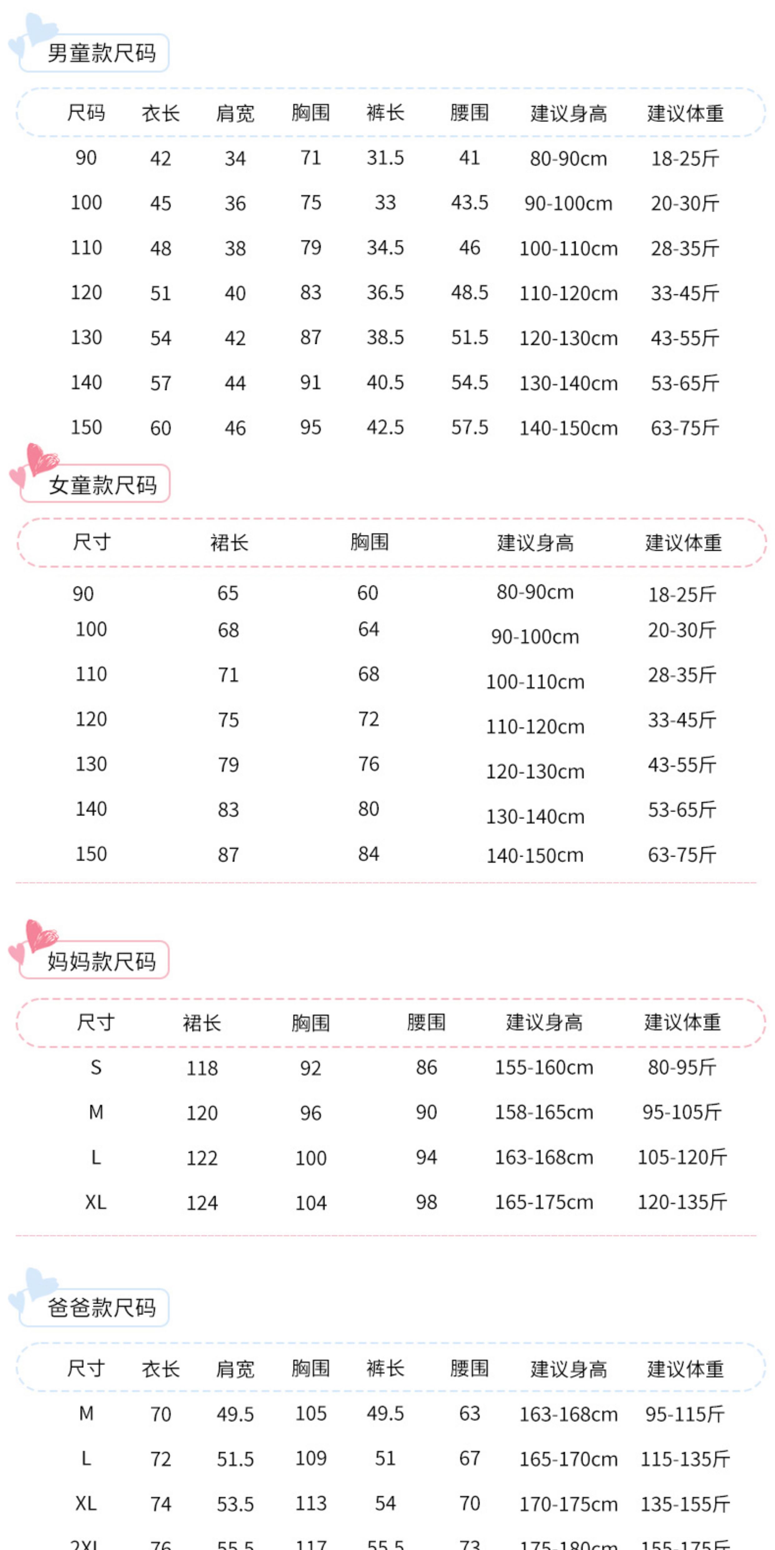 HeightDad L,Mom m,Mom L,Mom XL,Mom S,Dad m,Dad XL,Boys 90,Boys 100,Boys 110,Boys 120,Boys 130,Boys 140,Boys 150,Girls 90,Girls 100,Girls 110,Girls 120,Girls 130,Girls 140,Girls 150,Dad 2XL,Dad 3XL