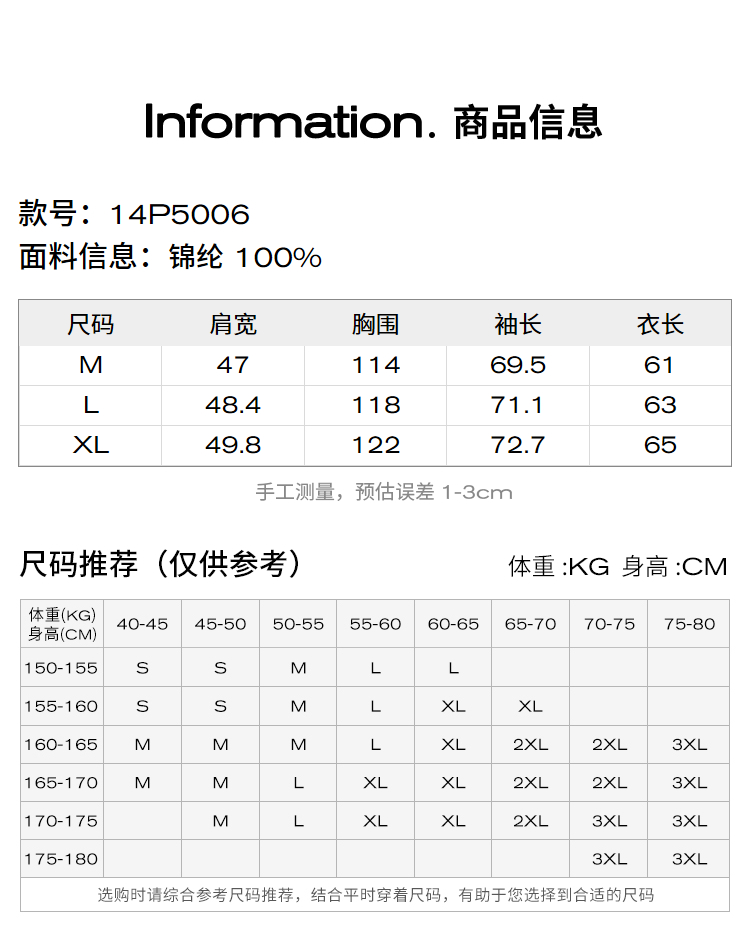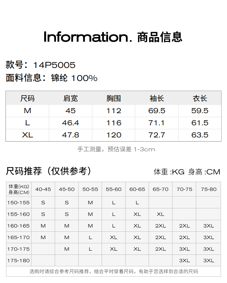 China (cm)160-165/84-86165-170 / 88-90167-172 / 92-96168-173 / 98-102170-176 / 106-110